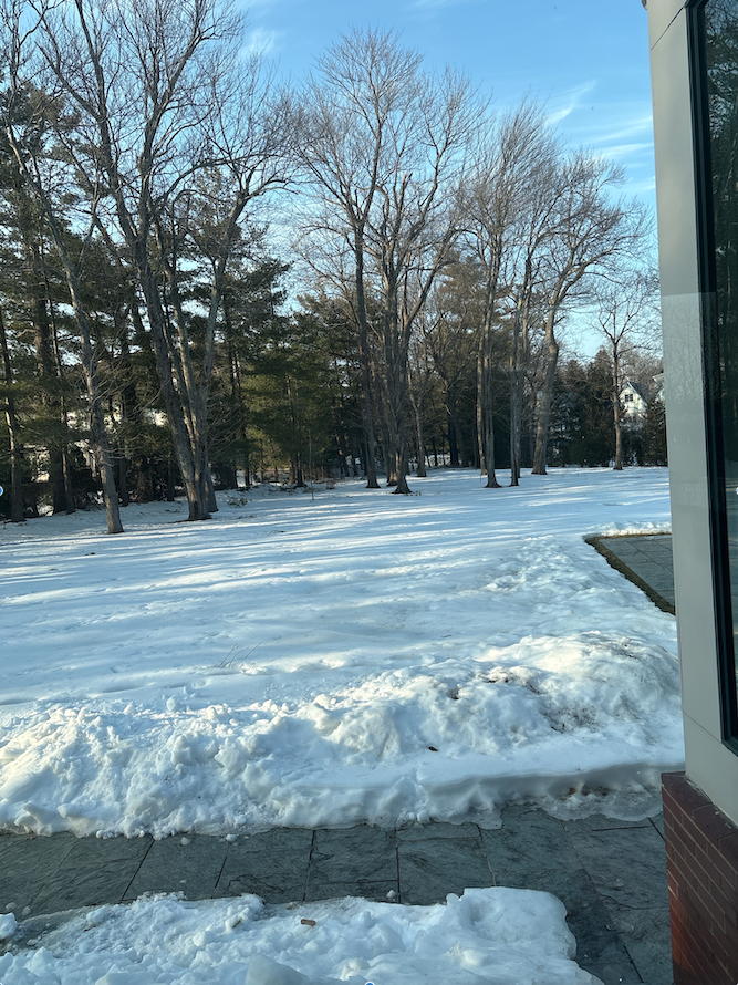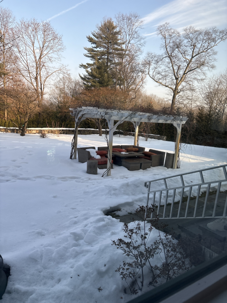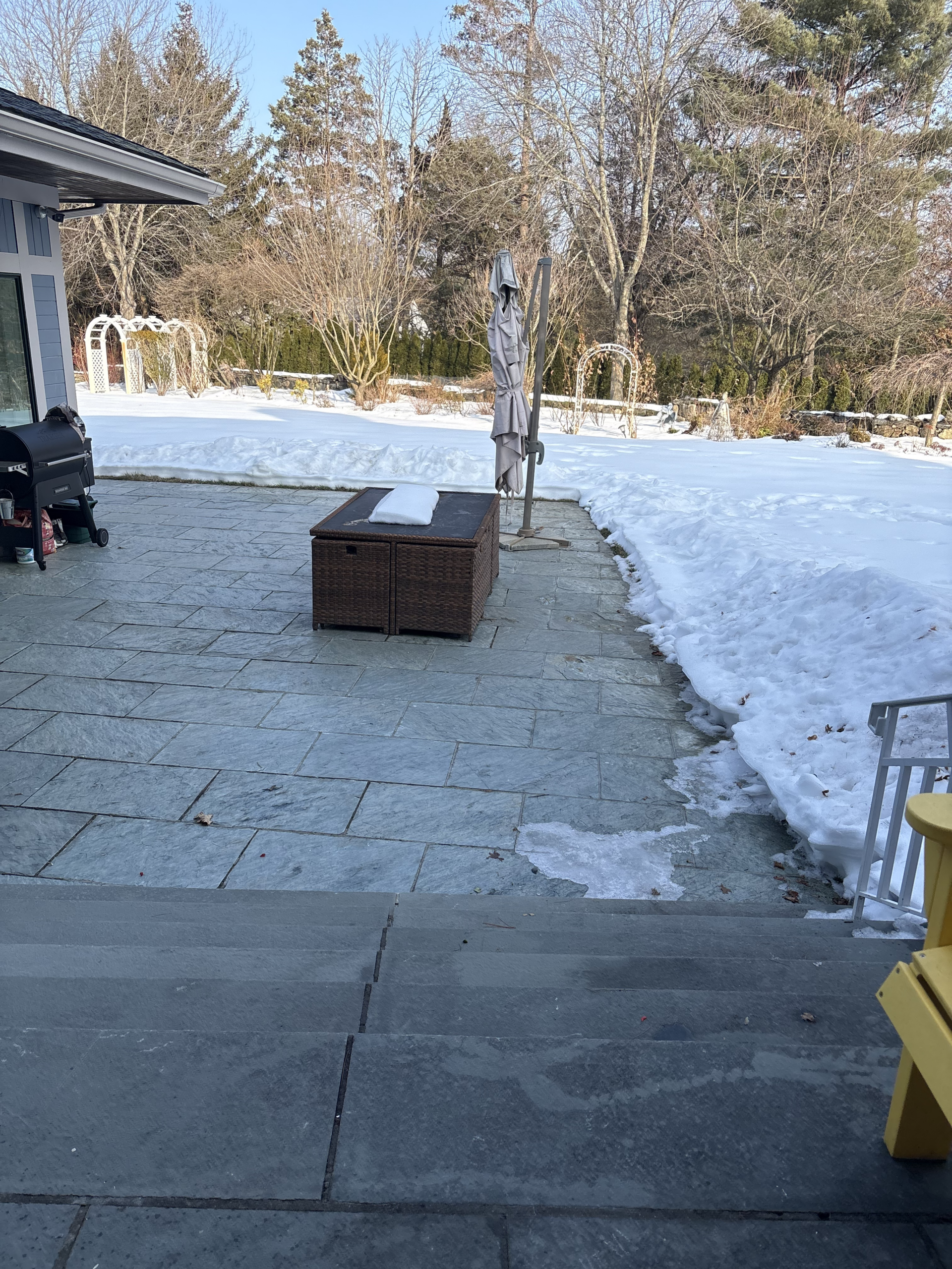 The snowy backyard, with a grey stone patio,