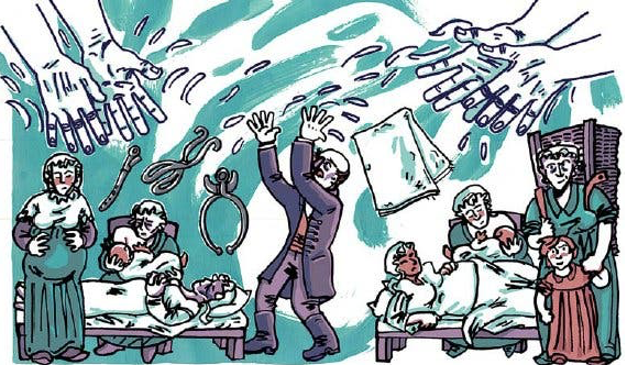 Semmelweis didn’t get a clue about the cause of this disease until he went back to his hospital and found that his colleague, Jakob Kolletschka, a pathologist (diagnose disease by examining organs, body tissues and fluids), had fallen ill and died. It was a common occurrence, according to Jacalyn Duffin who teaches history of medicine at Queens University in Kingston, Ontario. It wasn’t news because this often happens to pathologists, since he pricked his finger with a needle (suffering a scalpel laceration) while he was performing an autopsy on someone and got childbed fever and died. This piece of evidence told Semmelweis that not only women in childbirth can fall ill from childbed fever, but staff and other doctors and nurses in the hospital can also be infected too. Though this didn’t answer Semmelweis’s question, it gave him a clue, and he noticed that in the doctor’s ward they performed autopsies, while in the midwives ward they didn’t. So Semmelweis hypothesized that there were little pieces of corpses or what he called ‘cadaverous particles’ from the doctors and student’s hands when they perform autopsies, so when they delivered babies, these little pieces would get inside the women and cause them to develop the disease and die. So on May 15, 1847, Semmelweis made his staff start cleaning their hands and instruments with not only soap but also chlorine, which is the best disinfectant even today, but while Semmelweis didn’t know anything about germs, he was right, for the rate of death dropped significantly after the doctors and students starting cleaning their hands and instruments.