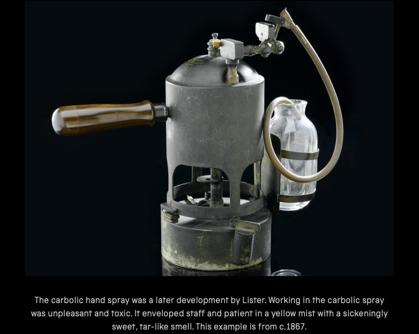 Moving on, we also have Joseph Lister, a British surgeon, and seen as the father of surgery. He was born in Sussex, England, in a Quaker family. In the 19th century, even if an operation was successful, the patient would have still been likely to die from infection. No one knew the cause of the infections and that was the final challenge to make surgery safe. Surgery was still not developed enough when Lister decided to study it in 1844, and Semmelweiss, being in Hungary wasn’t exactly a phone call away (they had barely even begun developing the telegraph at this time). Anesthetics, medications that temporarily reduce pain, were new and allowed surgeons to perform longer and more complicated procedures on patients, but they’d often die after the painless procedure, from the same problem: germs.