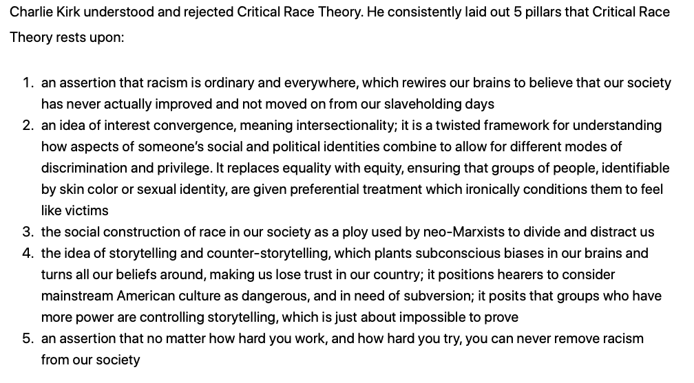 Kirk argued that if you obsess about race then you are more likely to become racist. He probed his listeners: do they even know that they are influenced by CRT? Can they define it, or do they just feel it and spout it? Charlie Kirk stated that Critical Race Theory destroys a society and that we should reject it.